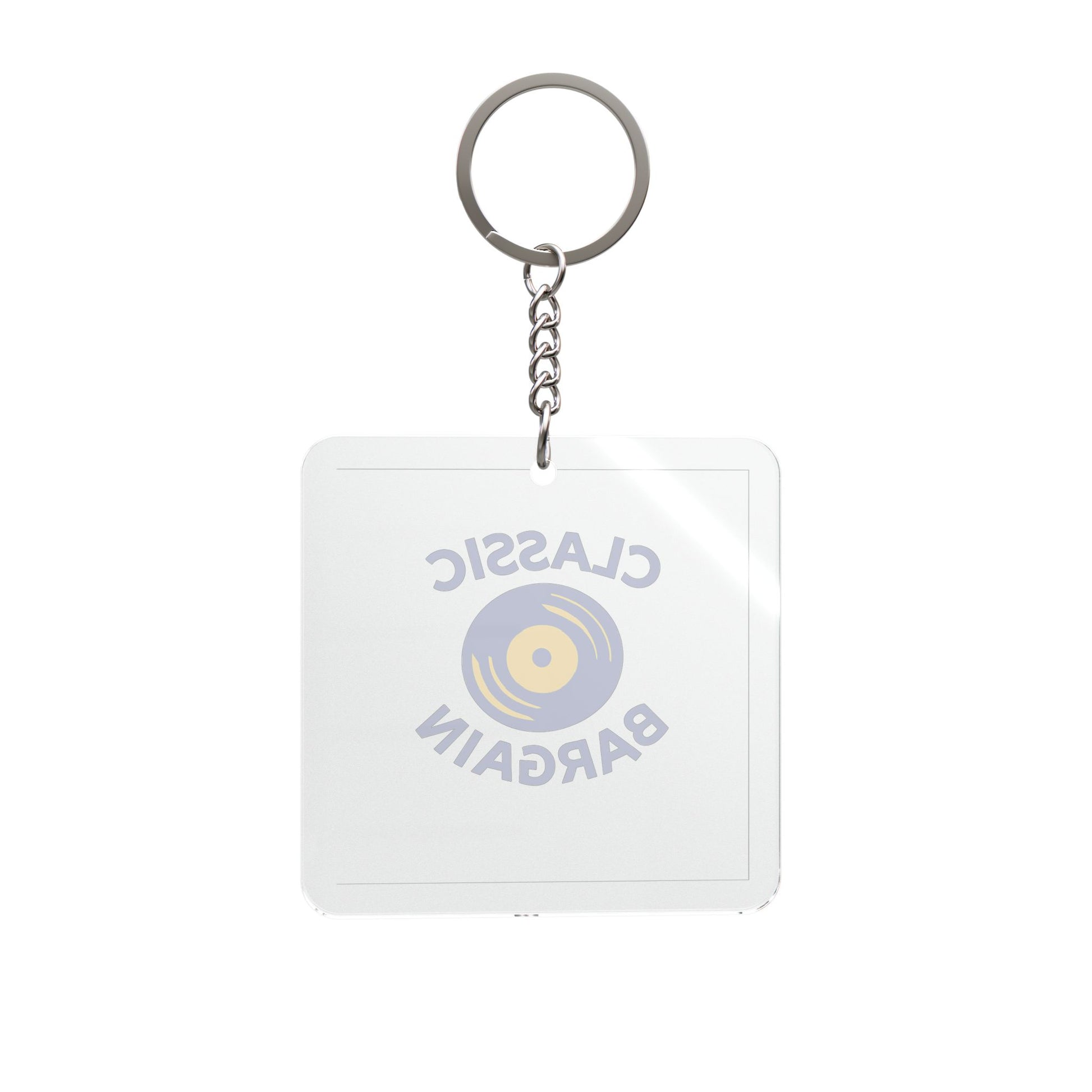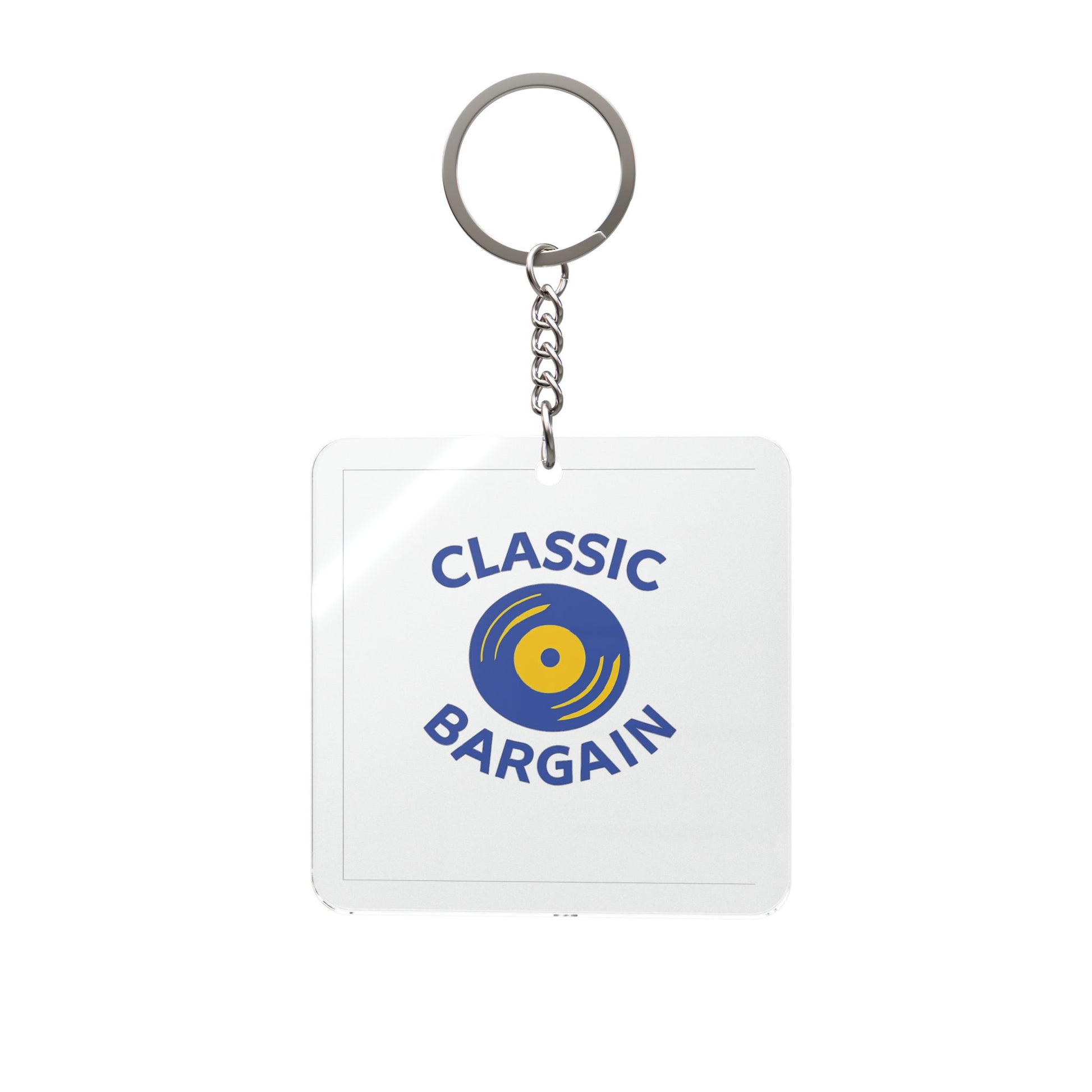 A lightweight, durable square keychain featuring the Classic Bargain™ logo — perfect for keys, backpacks, gig bags, or anything that needs a little vinyl-head flair.